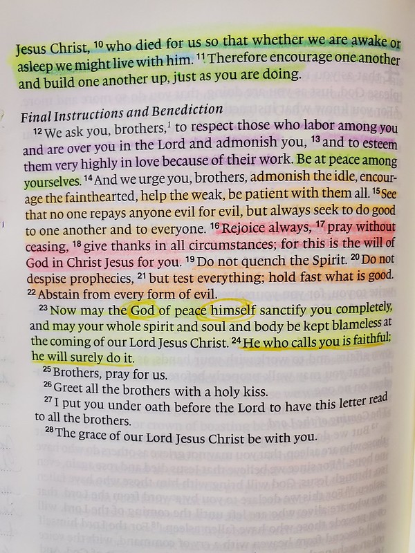 Paul saves the best for the end: He who calls you is faithful and He will do it [He will set apart and make holy those who follow Him]. Knowing that my salvation is in Jesus and my sanctification is the work of the God of peace Himself means I am free to act in love, choose joy, and use my mind.