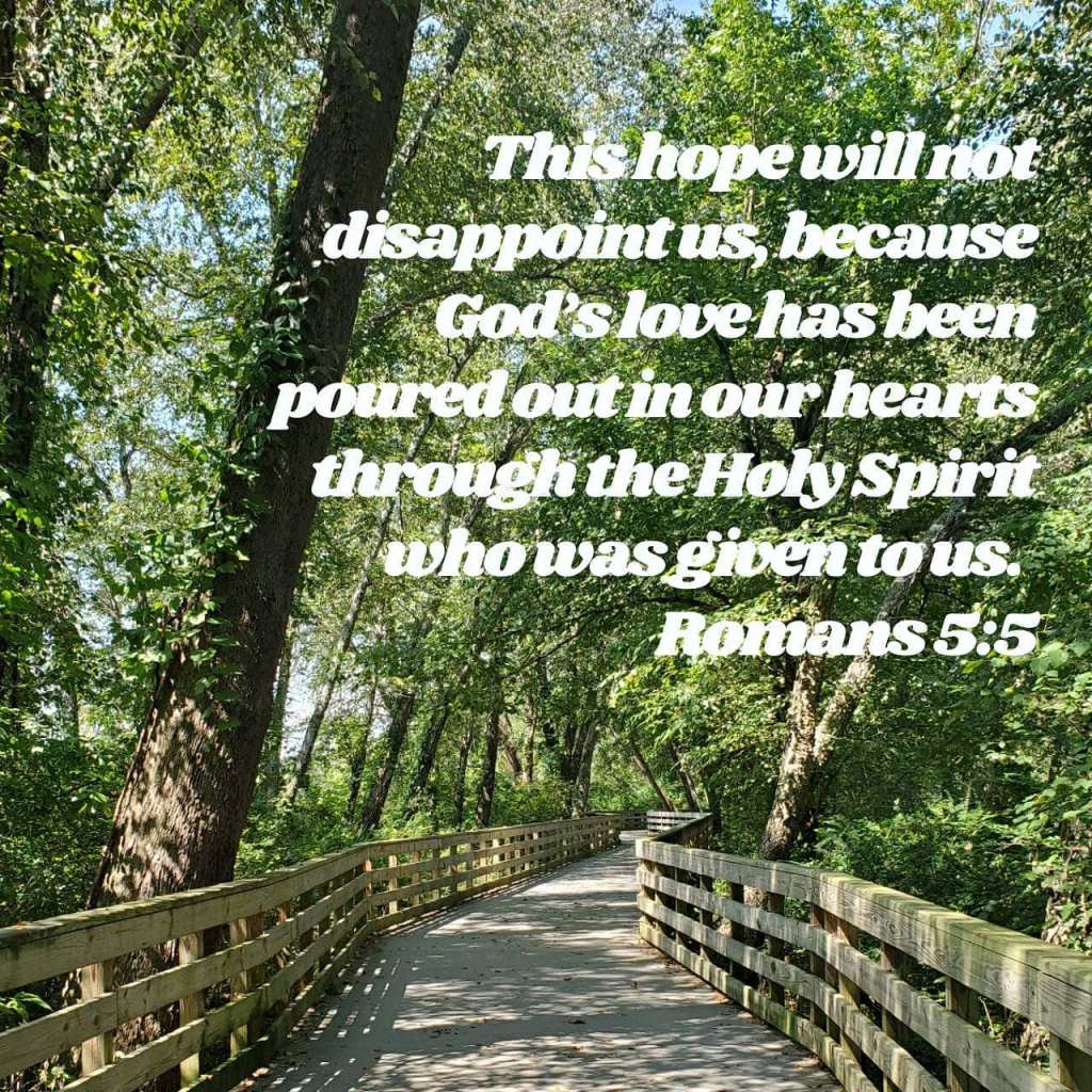 In short, hope produced by character through enduring suffering with joy opens the way for God to work in us and through us for His glory. How? He works in and through because we are grounded in His love instead of our fear. God’s love pours into our hearts and we act out of His love.