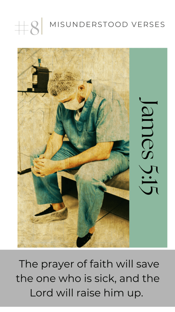 Also used as the “God will heal you if you have enough faith passage,” this verse is often the source of grief, shame, and fear, exactly the opposite purpose James had when he wrote the letter. Written to Jewish believers scattered around the Middle East, Northern Africa, and Southern Europe, the words were designed to encourage them in their persecution. James told them to “count it all joy” when they encountered trials. He instructed them to seek wisdom from God and remain steadfast in the things they knew to be true. He warned them to act on their convictions, watch their tongues, love each other regardless of social class, and stop quarreling over trivial matters. He reminded them that this world is temporary and that the Lord would return to judge evil.