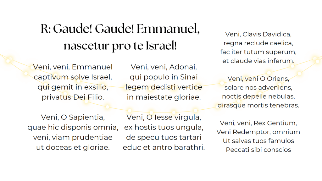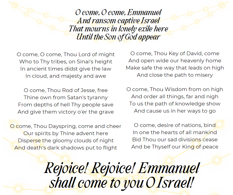O come, O come, Emmanuel, Thou Wisdom, Thou Lord of might, Thou Rod of Jesse, Thou King of David, Thou Dayspring, Thou Desire of nations!